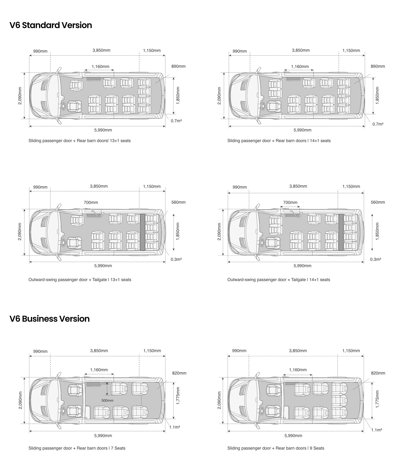 With an interior height of up to 1890mm, passengers enjoy ample headroom and easy boarding. The V6 luggage compartment offers a maximum storage space of 1.1 m³, capable of holding eight 26-inch plus four 20-inch suitcases.